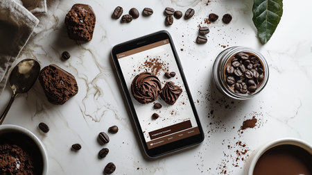 Various ingredients and smartphone on a dark kitchen counter setting