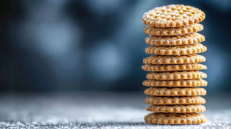 A tall stack of sweet round cookies sprinkled with sugar, set against a softly blurred background, perfect for dessert lovers and food enthusiasts.