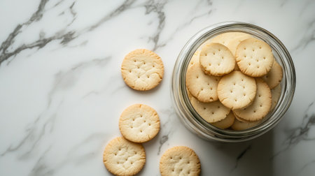 A clear glass jar filled with delicious plain crackers rests on a sleek marble surface. This inviting snack is perfect for gatherings, parties, or casual enjoyment.