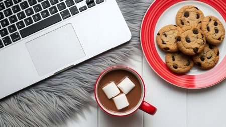 Cup of hot cocoa, cookies and laptop on white wooden table