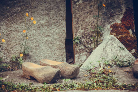 Enkhuizen, Netherlands. June 2022. Old worn clogs against a background of paving stones. High quality photo