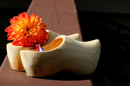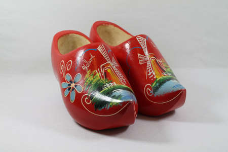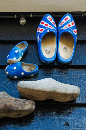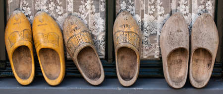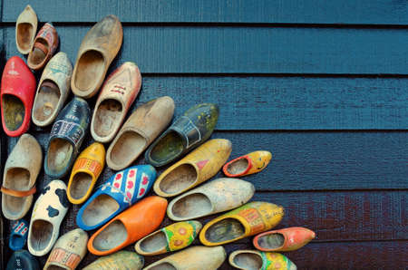 Regional tradition and culture, handmade concept. Wooden dutch shoes, traditional clogs footwear standing in row