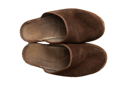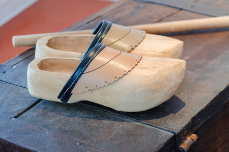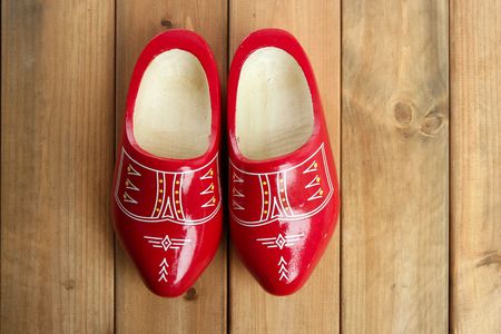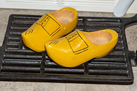 Old wooden dutch clogs on in house. Holland, Netherlands
