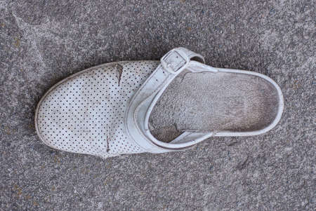 a dirty forgotten yellow plastic sandal on wet asphalt
