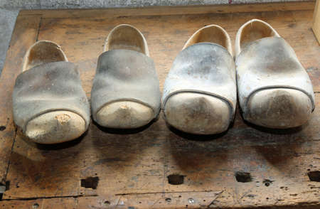 Dutch clogs craftsmen, manufacture of traditional footwear for the field