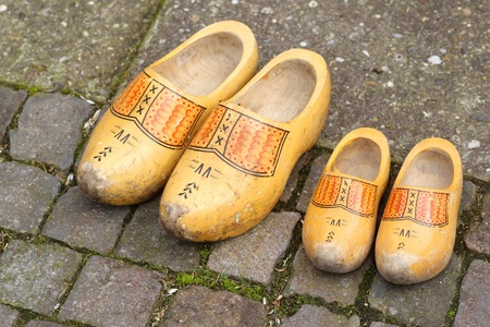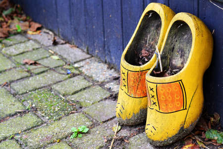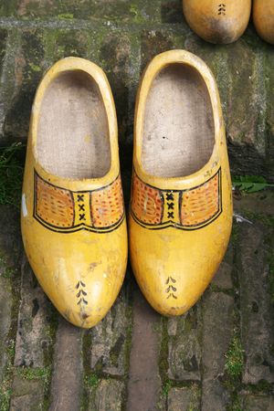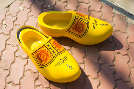 pair of traditional Dutch yellow wooden shoes on a stone footpath