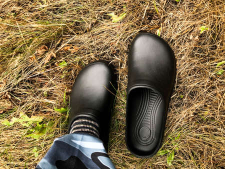black rubber overshoes are worn on one leg. shoes on dry grass. autumn walk through the forest. wet grass after rain. protection of feet and socks from wet and cold ground.