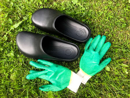 green rubber construction gloves next to black rubber overshoes. harvesting in autumn. protection of the skin of the hands and feet from poisons and water. cultivation of beds.