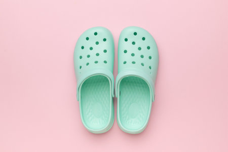 pair of Crocs sandals on a green background. Lightweight beach footwear.