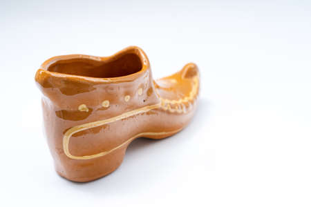 Miniature Dutch wooden shoes souvenir on a white background. Typical Dutch souvenir, houten klompen.