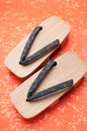 Japanese traditional geta sandal on yellow floor. Traditional Japanese asian wood footwear called Geta
