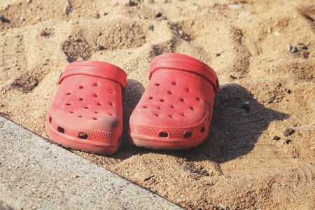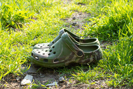 Plastic summer shoes for water recreation, camouflage summer beach shoes in the sunshine, trendy shoes