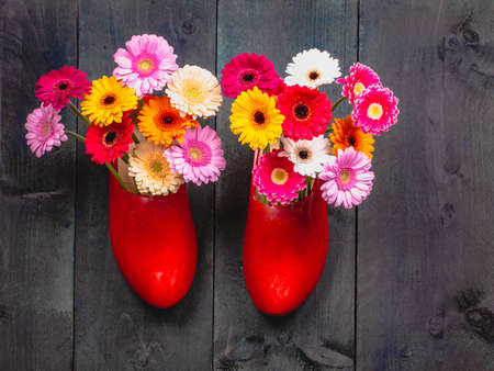 Two red wooden red clog with pink, yellow and red gerbera flowers, on gray wooden background, top view.