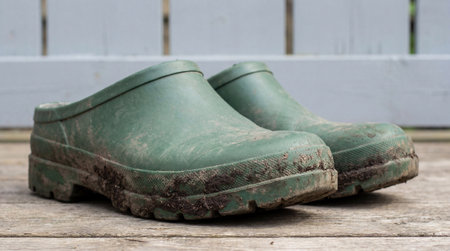 Worn green rubber gardening clogs resting on a wooden deck with dried mud and dirt on the soles and sides outdoors.