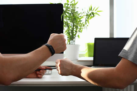 Male hands are joined by fists in working office close-up. Teamwork cooperation in business concept.