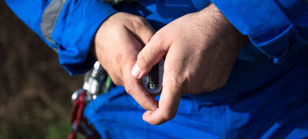 Electrician fastens the safety belt before climbing on the lamppost