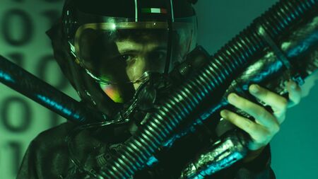 cyborg man of the future with helmet lights led and huge laser gun