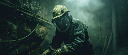 A man wearing a protective suit and mask works in a dark and foggy environment.