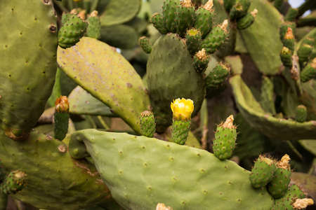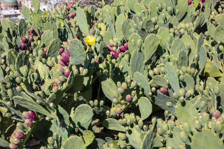 Blossom edible prickly pears (Opuntia ficus-indica) cactus plants, Sicily, Italy