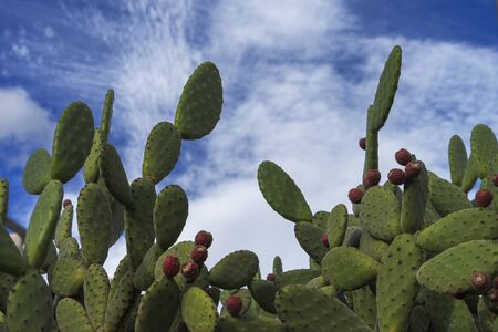 close-up of Opuntia ficus-indica, cactus pear or prickly pear, with red fruits