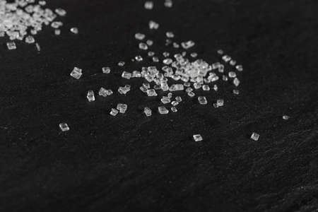 Big sugar crystals on black background close up. Macro shot of sucrose crystals, sea salt rock or granulated sodium salt texture on food slate with selective focus