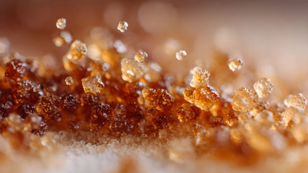 Macro shot of brown sugar crystals, showcasing their texture and color. Ideal for food and baking themes.
