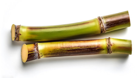 Sugarcane stalks with cross-sections showing juicy interiors, placed on a clean black background.