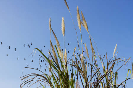 grass flower, grass flower bush with Indian Whistling Duck flying.