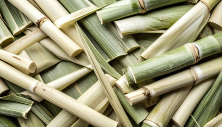 Capture of freshly harvested sugar cane stalks resting on the ground in an agricultural field. The warm sunlight beautifully highlights the textures and colors, evoking a sense of abundance and connection to nature. Perfect for agricultural or environmental themes.