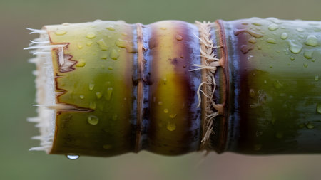 A macro shot captures the intricate details of a green and purple sugarcane stalk covered in fresh water droplets. The textured nodes and fibrous surface are sharp against a soft, blurred green background, emphasizing freshness and natural agriculture.