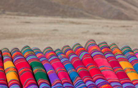 Vibrant mexican serape textiles displayed outdoors during sunset. That the image is generated using AI.