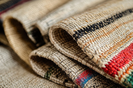 A close-up image capturing the intricate woven texture of a folded rug, showcasing the colorful stripes and fine details of the fabric.