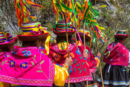 People in typical costumes at traditional festival of peasant communities in the Paron lagoon, August 23, 2023, Peru