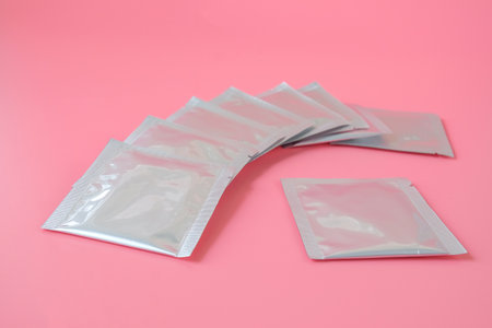 Small foil package by wet antibacterial wipe, mock up, space for text, top view