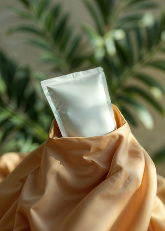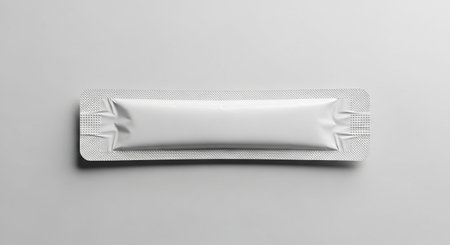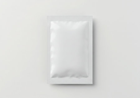 Plain white flexible package, ideal for food, medicine, or small products, resting on a light blue surface with natural sunlight and shadow. minimalist and clean product presentation.