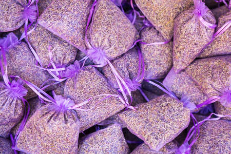 Bags with dried lavender in a basket on the market