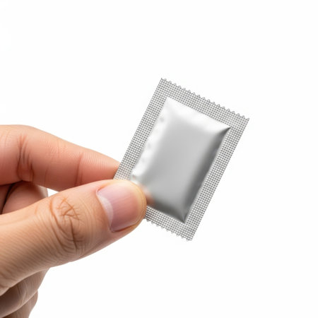 Hand holding condom packet isolated on white background