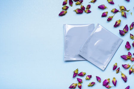 Two blue plastic tea bag sachets or envelopes with dry rosebuds. Top view, copy space.
