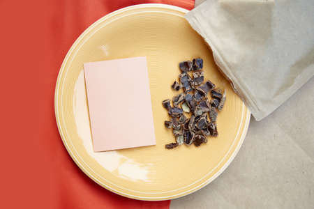 Carob - coffee alternative - organic product on the plate. Natural plant-based caffeine antioxidants. Mock up of business card. High quality photo