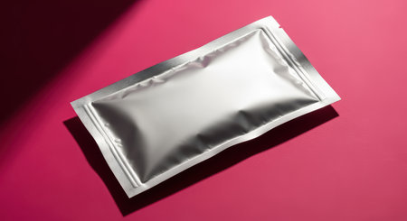 Silver foil pouch on vibrant pink surface