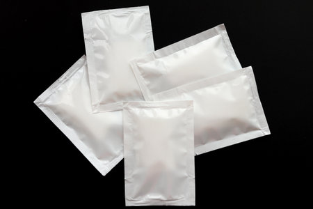 Blank white sachet packets stack mockup isolated on black background. Empty airtight pack mock-up for sauce, coffee, wet wipe, mayonnaise.