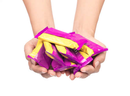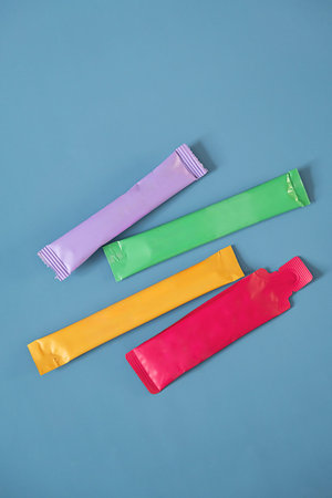 Colorful sachets packets on blue background with empty space for design. Product packaging concept.