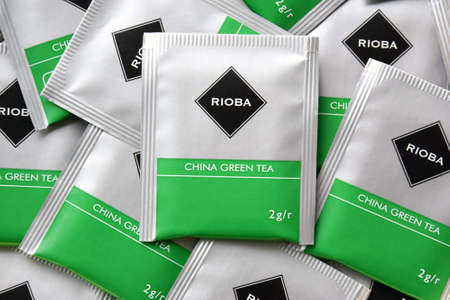 Kharkiv, Ukraine - November 5, 2021: Lots of Rioba tea bags. Green and black tea.
