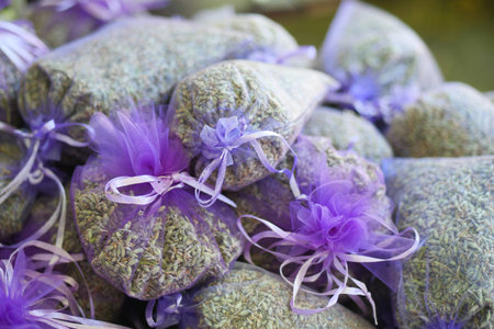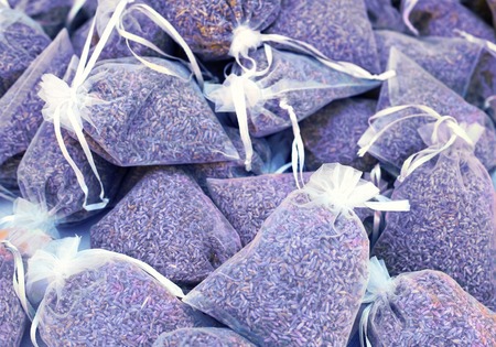 Purple sachets filled with dried lavender creating a fragrant and colorful display in Nyons, Drome, France