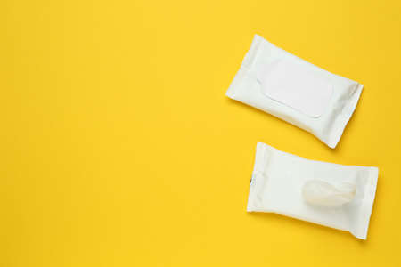Wet wipes flow packs on yellow background, flat lay. Space for text