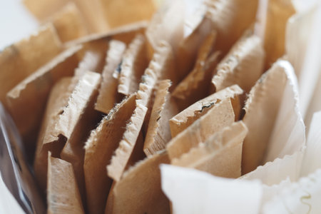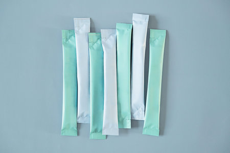 Minimalistic layout of powder stick sachets. Convenient single serve packaging for drinks, supplements, and food products. Flat lay with blank space.