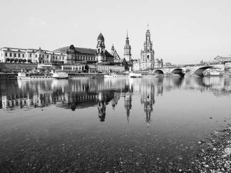 Dresden Cathedral of the Holy Trinity aka Hofkirche Kathedrale Sanctissimae Trinitatis in Dresden Germany seen from the Elbe river in black and white
