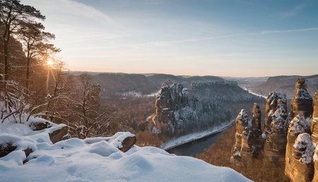 Panoramic view of the famous sandstone cliffs of the Elbe Sandstone Mountains in Saxon Switzerland in winter