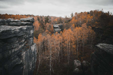 view on the rocks and the autumn forest around, National park Tiské stěny, Czech republic,