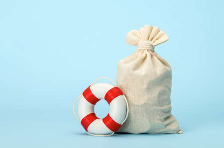hand holds a canvas bag full of money with a US dollar icon on a blue background. Budget planning concept, profit and savings, final financial result